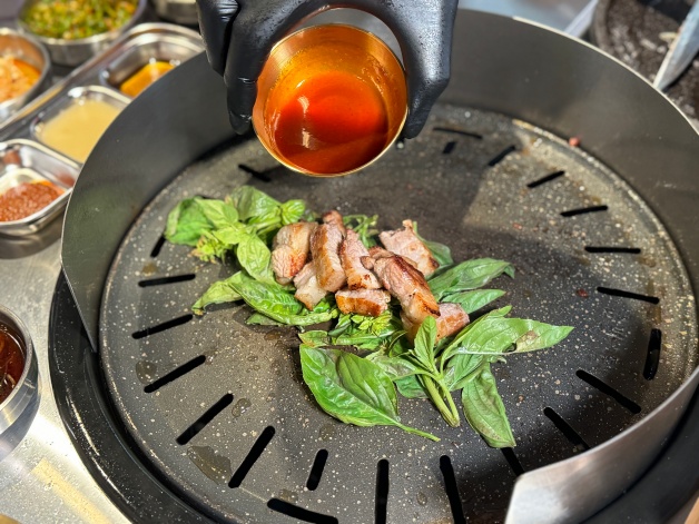 沒想到豬五花也可以這樣吃吧!第三吃「爆炒醬羅勒」,在鐵板先放上羅勒,加入豬五花和金咕秘製韓醬,直接給它爆炒起來,羅勒香氣撲鼻,妞編輯覺得不僅可以取代醬蟹當「偷飯賊」,還妥妥就是「下酒菜」無誤!