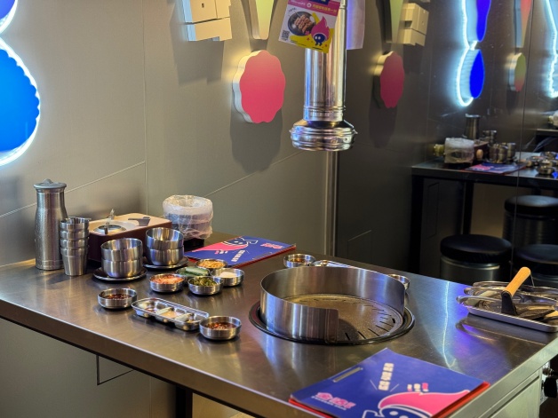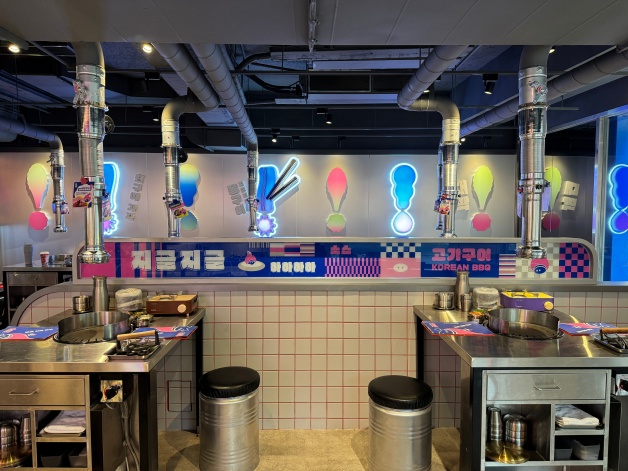 首店進駐台北西門町商圈,位在知名滷味老天祿旁的二三樓,總坪數50坪,座位數高達95席,共有雙人、四人、六人桌,主色調選用「灰、粉、藍」三色,在空間設計加入金屬、不鏽鋼等材質,並添加韓文和烤肉的元素進行妝點!