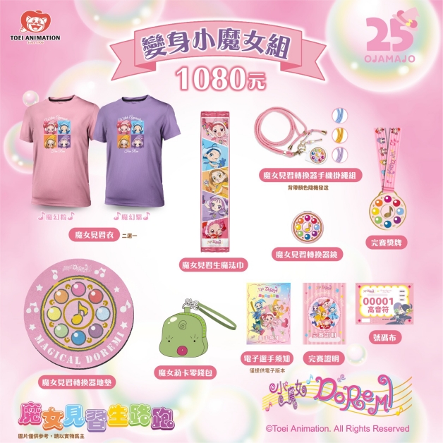 《小魔女Doremi》路跑共推出2款物資,「變身小魔女組」包含一系列超萌《小魔女Doremi》周邊,「見習衣」、「魔法巾」、「手機掛繩」、「轉換器鏡」、「轉換器地墊」、「零錢包」以及「完賽獎牌」、「號碼布」。身為鐵粉的妞編輯必收「零錢包」、「零錢包」,魔女莉卡大頭變身零錢包萌翻,而擁有轉換器地墊彷彿隨時能變身!