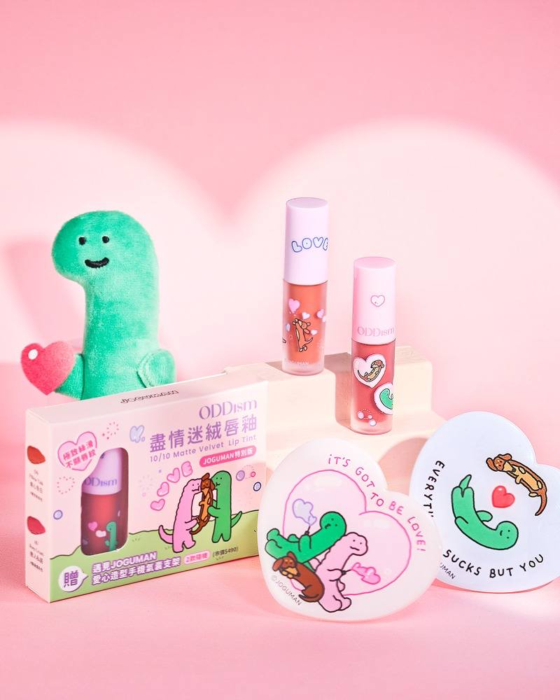 JOGUMAN粉暴動!台灣純素美妝品牌ODDism,首次聯手韓國文創最紅小恐龍JOGUMAN,最受歡迎的主角草食性恐龍Brachio,這次還帶來寵物臘腸狗WOODY和啤酒控DIPLO兩位小夥伴一起現身。將ODDism經典熱賣的「盡情迷絨唇釉」推出「JOGUMAN特別版」,除了限定包裝外,還打造JOGUMAN特別版裸粉調限定色,期間限定販售JOGUMAN大全套整組,一次入手限定2色#偷心告白和#戀人私語,還附贈JOGUMAN愛心造型氣囊手機支架,共有兩款採隨機贈送,單筆消費滿1000元,且至少含一組JOGUMAN特別版禮盒組,還可以獲得「JOGUMAN娃娃吊飾(心兒怦怦跳款)」乙隻。