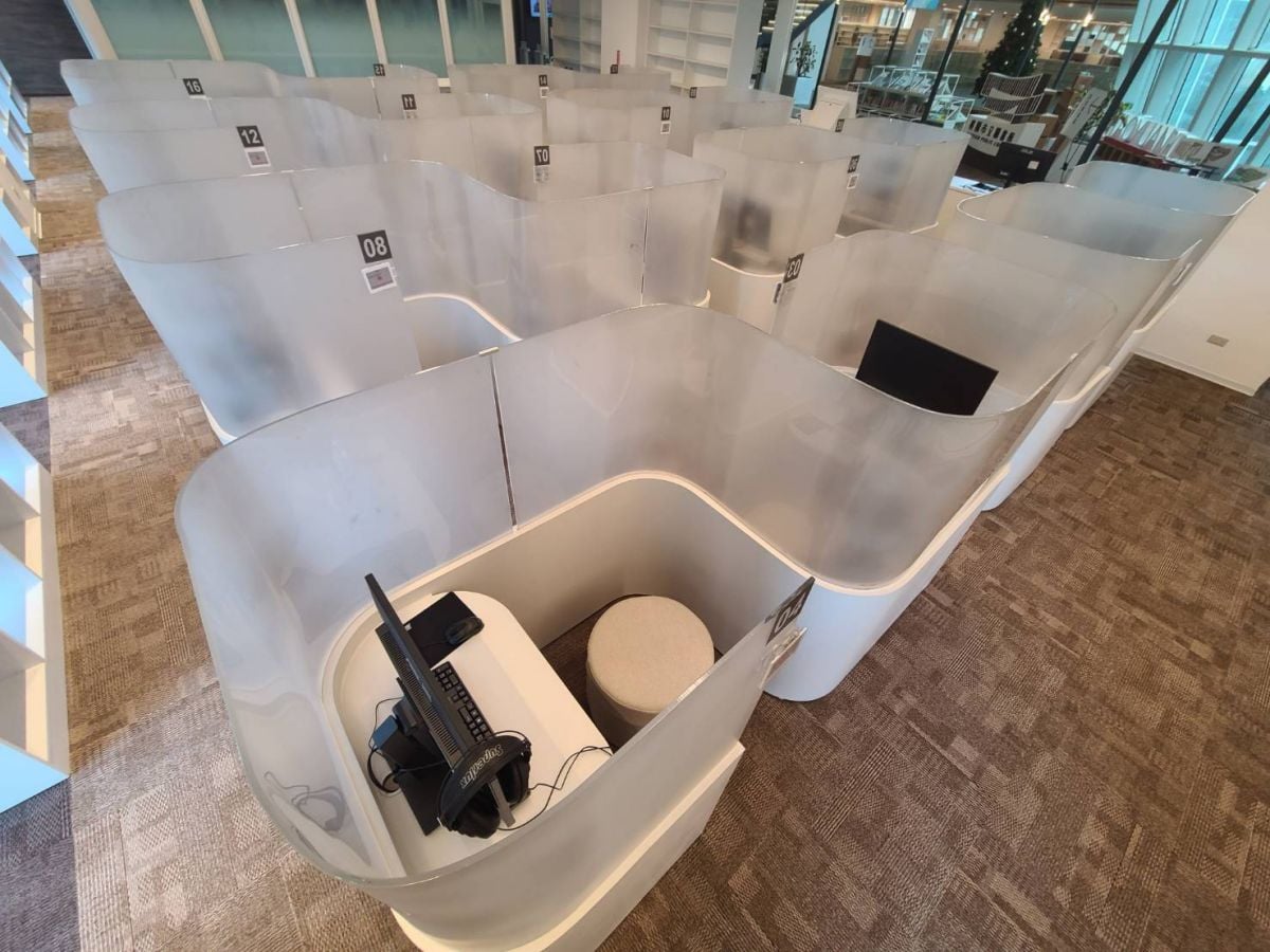 新總館共有6台「自助借書機」,分布於2到5樓及7樓,借書、掃描借書證、放上書本,3步驟輕鬆將自己喜愛的書本帶回家觀看,3樓親子區也特別設置2台兒童式客製化自助借書機,吸引孩童從小閱讀。為了讓大家安心借書,圖書館設置了6台圖書滅菌機,自助借書機旁邊都有一台,讓我們在將書本帶回家的同時,也不讓病毒趁虛而入。