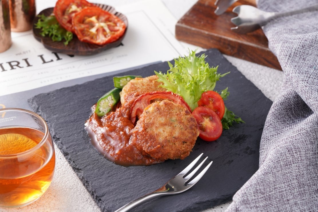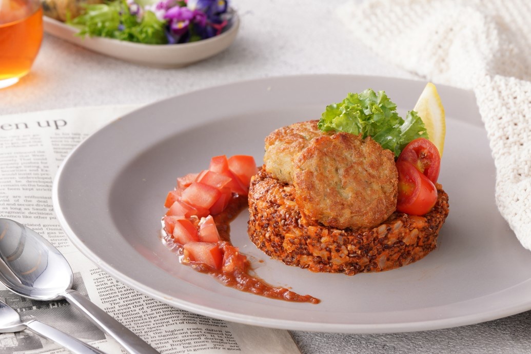由花椰菜米、紅藜麥、天然番茄組成紅色夢幻組合的「夢幻茄醬海鮮餅」,口感層次豐富,再為蔬食料理拓展誘人風貌!