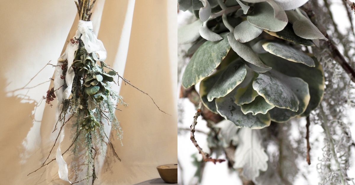 以日本民間故事「白鶴報恩」為靈感,設計師以倒掛的植束比擬故事中丹頂鶴的仙羽身姿,讓觀者如同處在瑞雪紛飛的日子裡,望見觸人心弦的那一刻。在充滿冬季氣氛的植束中,設計師以銀葉菊、鶴頂蘭與青霧色的多肉植物組合比擬為白鶴身上的豐厚羽衣,紅仁丹則代表著仙鶴的紅色肉冠,交錯在冬季苔枝之間,如筆直的長喙般舞著故事中的感激之情。紮實又修長的設計以潔白無暇的魚尾紗收攏,自然垂落於開展的枝條間,幻化成白鶴表達謝意的精織匹布。
