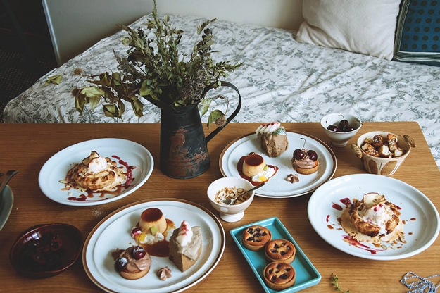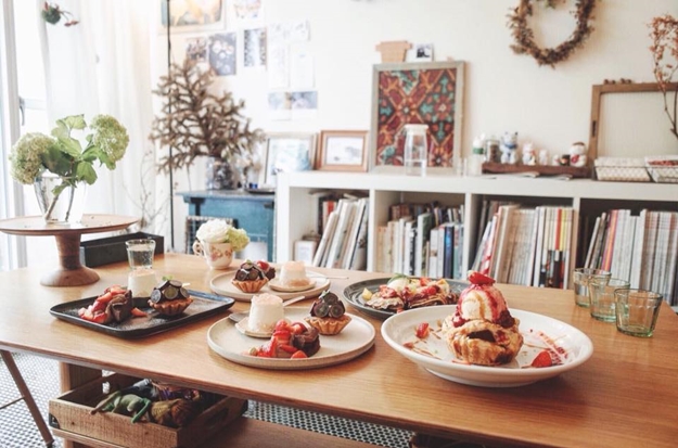 屋內空間一邊是女主人的甜點工作室與私人住家,另一邊則是客人用餐的空間,布置風格溫馨淡雅,裝飾著許多各地收藏而來的小物和日文書刊,豐富卻又不凌亂,可以感受到女主人的溫柔氣息。空氣裡還飄著烤派皮的香氣,與周遭的花草氣息融合在一起,相當愜意。幸運的話,還能看到女主人養的小貓咪唷!(可惜妞編輯沒有遇見,牠們太害羞躲起來了嗚嗚)