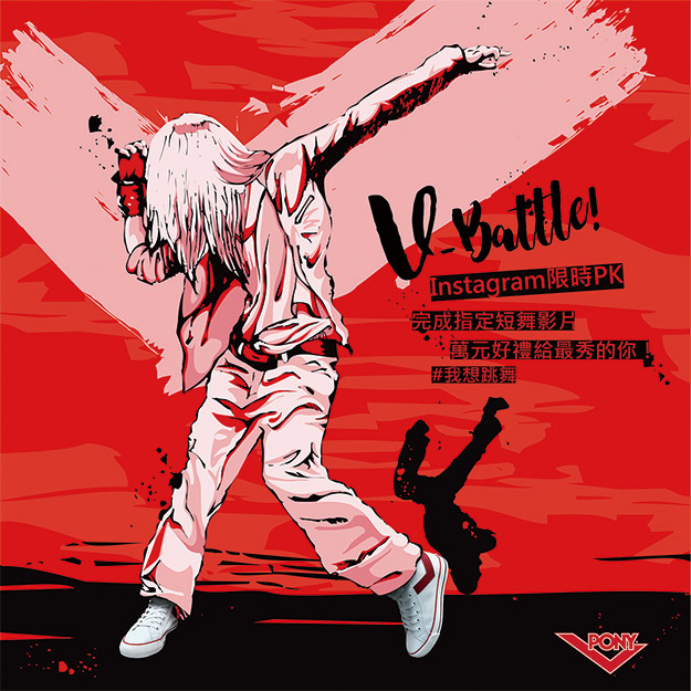 「只要在Instagram標上#,每個人都可以擁有自己的閃亮舞台。」有鑑於街舞Battle興起,卻不是每個舞風或是音樂都適合實體激昂的賽事場合,加上投注在參賽的金額及時間都是成本,導致有更多的人傾向喜歡在自己的社群平台上分享自己的心情舞蹈或練習影片,因此PONY攜手TWSDA台灣街舞藝術協會,首度舉辦線上街舞分享活動【V-Battle!Instagram限時PK】不須繁瑣的報名流程、開放式創意表演機會、不受時間或場域限制、贈送高額獎項等優勢,藉此吸引更多年輕族群以輕鬆的自信姿態投入街舞運動。