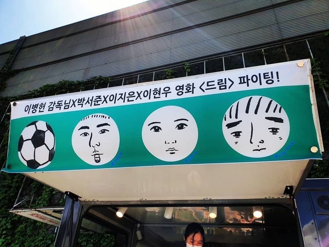 稍早韓網曝光一組熱騰騰的「應援餐車認證照」,這位慷慨請客的義氣男就是男神「金秀賢」,他不但為好友IU、朴敘俊以及李玹雨獻上應援,同時不忘幫導演李炳憲加油打氣,大大地在應援橫幅上寫上:「李炳憲導演、朴敘俊、李知恩、李玹雨,電影《Dream》加油」,同時超有SENSE選用《Dream》引爆熱議的電影海報,只截取應援對象的插畫版本~