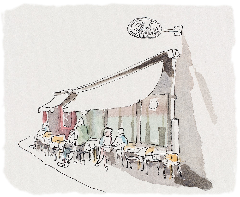 我去到街上一家「秋麵包店」(Aki Boulangerie)點了咖啡和甜食,與一些當地人坐在店裡,享用我初來乍到巴黎的第一份下午茶,選擇進入一家店名為日文翻譯出來的咖啡館,先為自己開啟一道由亞洲人模式通往歐洲人模式的閘口。今天的天氣很好,許多巴黎人都在戶外座位區享受陽光,他們也喜歡親近草地,我常想著赤腳斜躺在地上聞泥土的味道、被陽光直接照射等這些日常習慣,是不是因為國情而有所不同;外國人多半喜歡這樣做,但是我們則會坐在木椅子上,並選擇有樹蔭的位置,包括我自己。