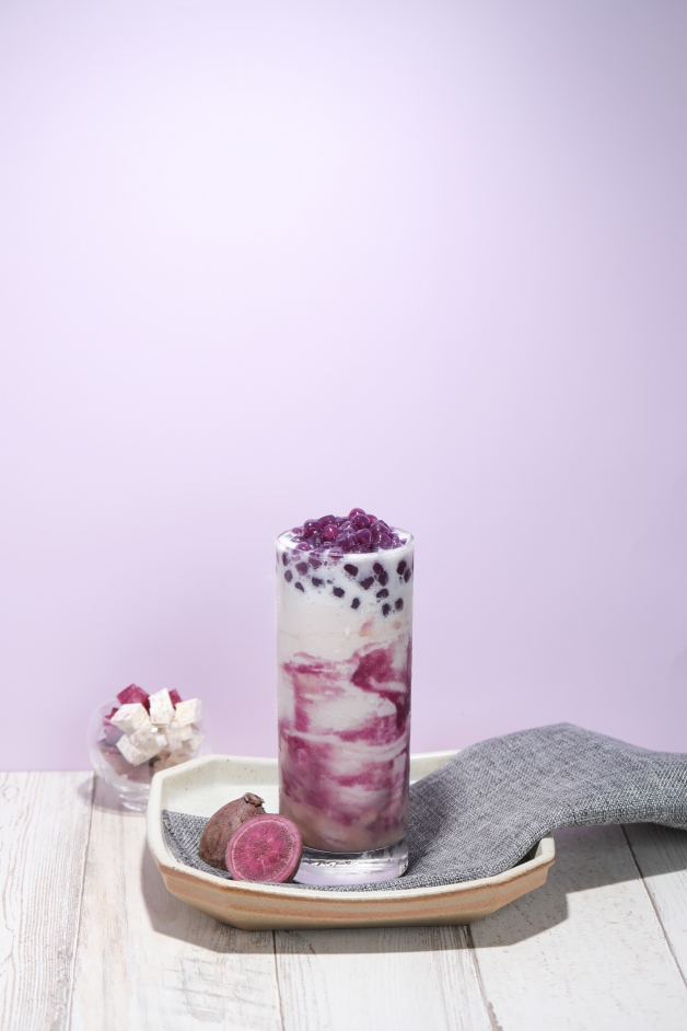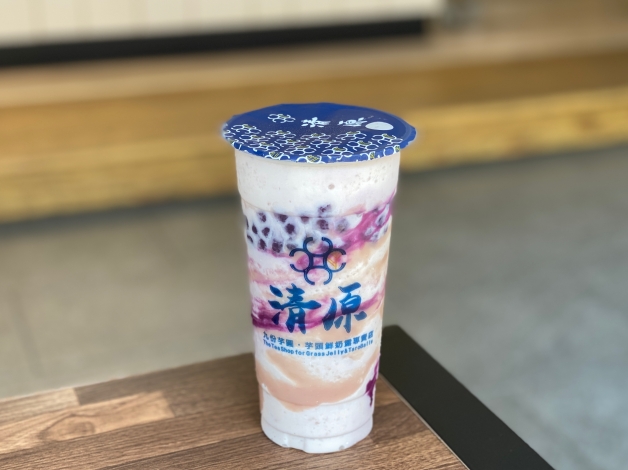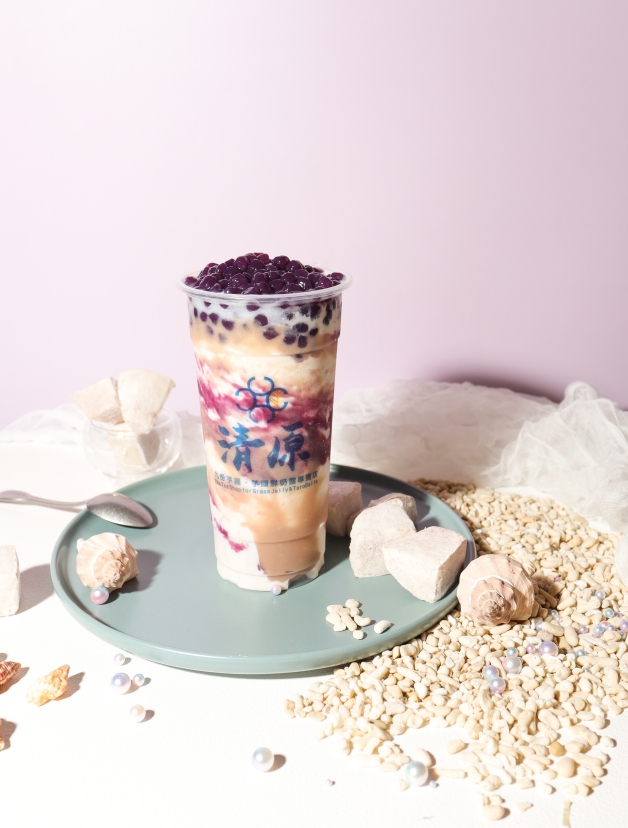 以香菜手搖飲創下超高討論度的清原芋圓,這次將「紫薯」與「芋頭」結合,推出「紫芋波波沙」,靈感來自於卡通片《珍珠美人魚》,希望呈現一杯讓人回味童年又有練要趕的飲品,外觀打造出美人魚般的夢幻感,使用台灣在地食材紫薯地瓜和大甲芋頭泥,將大甲芋頭泥、芋頭冰沙搭配紫薯地瓜,最後倒入香濃鮮乳渲染出紫色漸層色調,堅持手工搓揉加上低溫烘培,波波吃起來Q彈又有嚼勁,入口更是香甜濃!