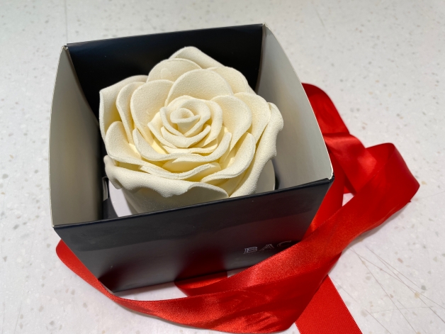 「白色戀人」是BAC最具代表性的玫瑰造型蛋糕,外觀是一朵盛開的潔白玫瑰,帶有純潔之意,基底蛋糕體是「香草戚風蛋糕體」,內餡的部分則選用溫柔又甜蜜的「海鹽香草風味」,並佐以「奶油起司抹醬」,最外層的綻放的花瓣則是手工捏製而成的「白巧克力花瓣」,甜而不膩中又帶點香醇風味,而且妞編輯覺得淡淡的緞面光澤和柔軟弧線實在是太美了!