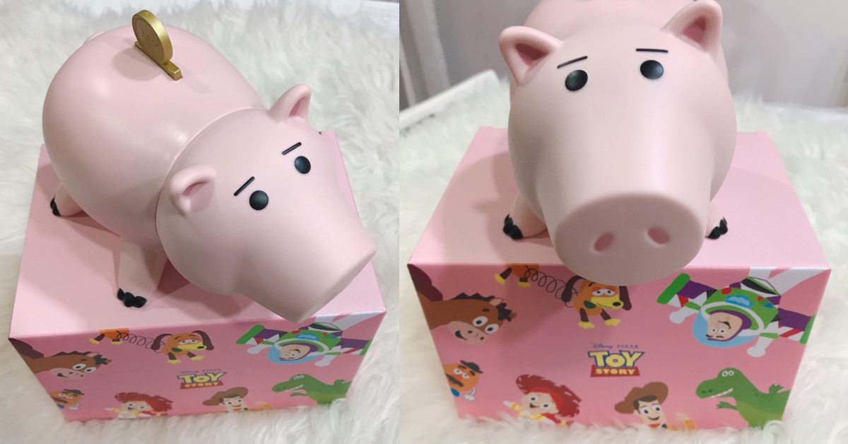 本尊真的超級可愛!就算是滿額贈,但質感還是有顧好好,從外盒包裝就很用心,四面都不同圖案,火腿豬豬撲滿大小也很剛好,真的會讓人不自覺想要掏錢存入(笑)