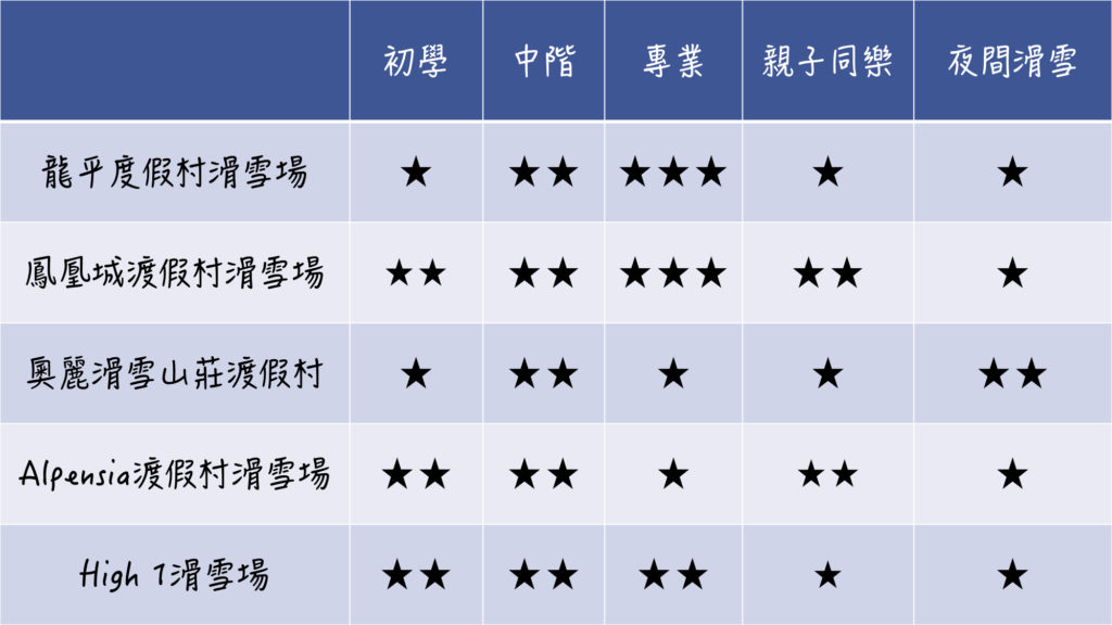•難易度:初級到選手級都有,雪道數量平均分布。