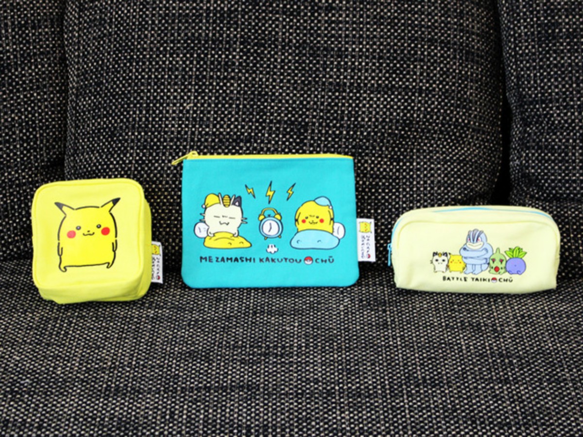袋子部分推出了手提袋與小收納包。手提袋有兩種尺寸,圖案都不一樣,左邊是寶可夢正在翻包包(?)的模樣,右邊則是寶可夢們的日常;收納包則有皮卡丘方包、喵喵&皮卡丘賴床與全員集合款長形包三款,適合用來放行動電源、化妝品等個人小物。