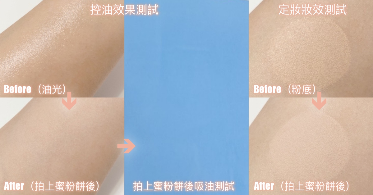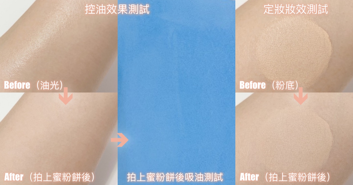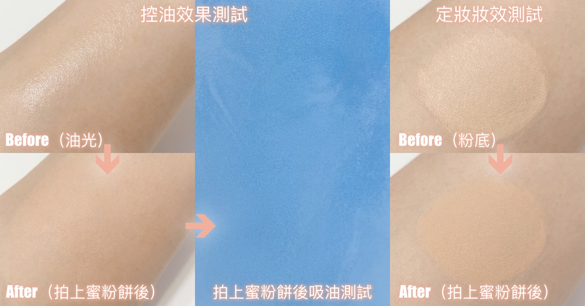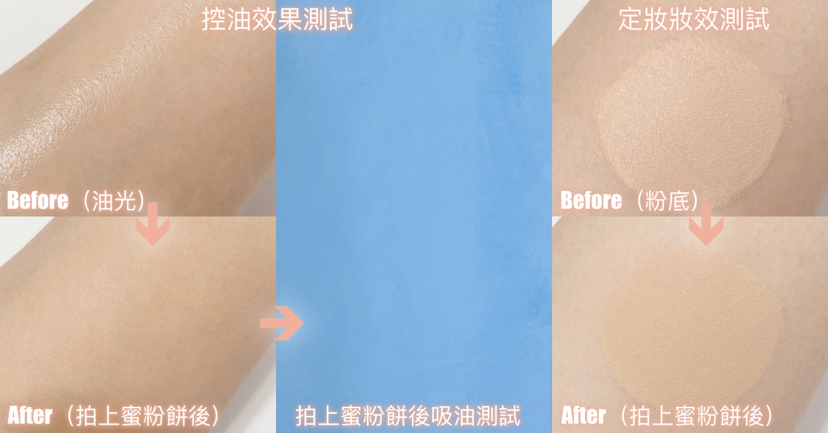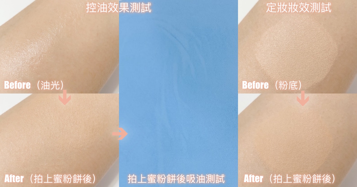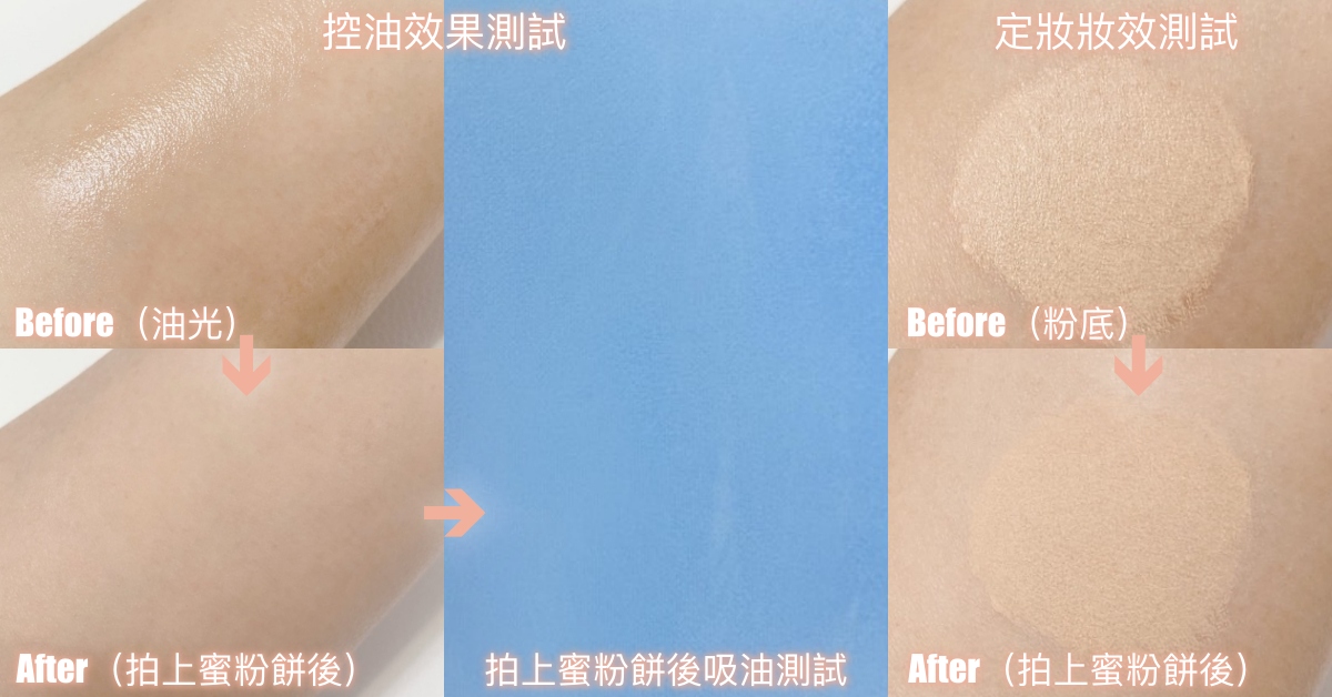 #控油效果實測:a.油光測試:均勻塗抹等量嬰兒油於肌膚上(模擬出油油光),接著固定拍按3下蜜粉餅上妝,觀察其消除油光的修飾效果。b.吸油測試:在a油光上妝測試後3分鐘,以吸油面紙輕輕在肌膚上按壓一下,以出油程度觀察其控油力。(以a.+ b.結果作綜合評分)