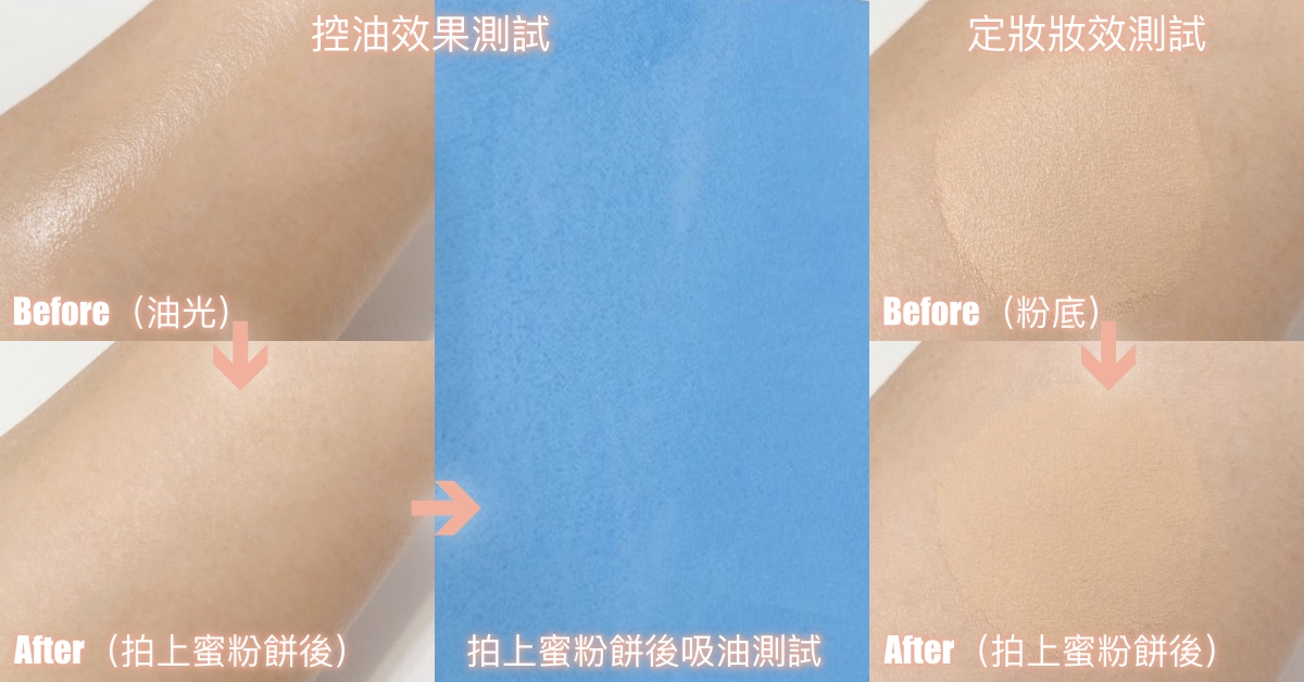 #定妝妝效實測:先塗抹適量粉底液於肌膚上,接著固定拍按3下蜜粉餅作定妝,觀察其底妝定妝效果&妝感。