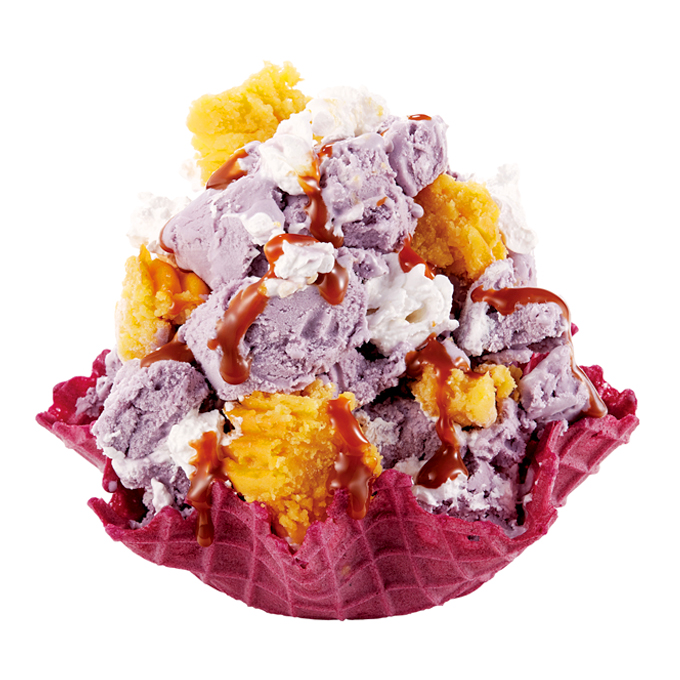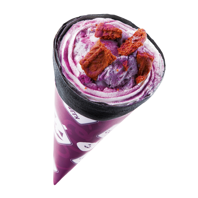 但這些紫紫的顏色,其實是來自南九州產的紫薯,紫薯與南瓜口味的冰淇淋裝在同樣是紫薯製成的餅乾杯裡,最後再淋上焦糖醬,就是充滿萬聖節風格的秋季冰品啦!