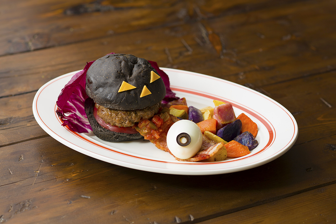 除了顏色很應景的紫薯鬆餅,還有鮮嫩多汁的墨魚牛肉漢堡,還附上眼珠一顆~