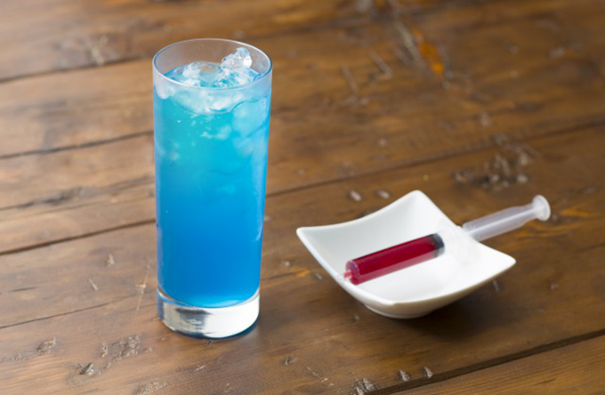 去年大受歡迎的萬聖節檸檬汁, 將針筒中的草莓醬緩緩注射到汽水裡,會調出詭異的顏色喔!(妞編輯猜應該是紫色)