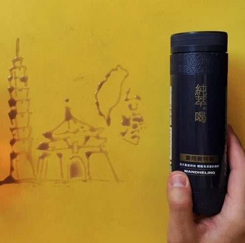 看來化妝品飲料系列,不僅抓住韓妞們的心,現在連dududedoodle也愛不釋手。一抵達台灣,喜歡喝咖啡的他,就買了瓶他想念的重烘焙咖啡來品嚐,並用咖啡把小蕃薯島和台北101給畫了出來。(怎麼突然有股濃濃的咖啡香呢~)