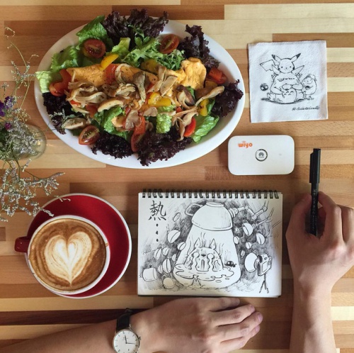 台北實在太熱了,殘酷的陽「光一」直曬在即將融化的龍貓身上啊!不僅如此,連餐巾紙也成為dududedoodle的圖畫紙,看呆萌的皮卡丘壓在龍貓的背上。(龍貓翻白眼)
