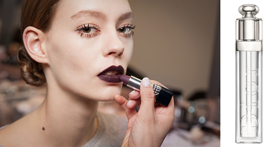 極深濃的紫莓紅色,能呈現深邃如黑色般的性感誘人。而迪奧全球彩妝創意形象總監 Peter Philips則會再疊上癮誘鏡光俏唇彩#Bulle(右;台灣未上市),為雙唇打造鏡光妝效。