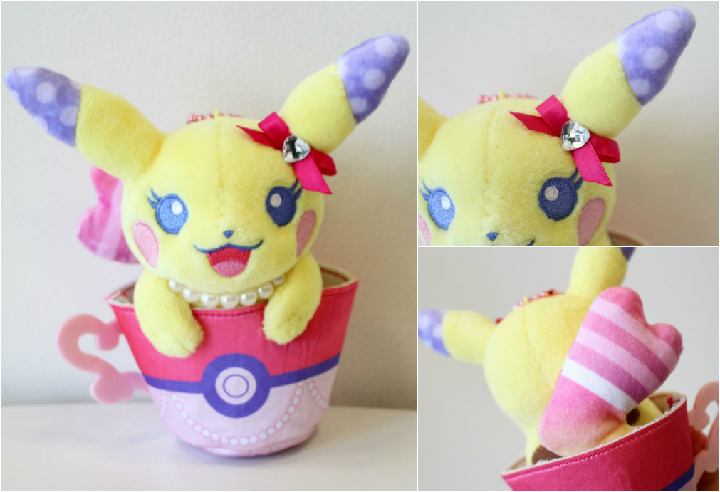 女版皮卡丘最大的不同,就是有愛心圖案的尾巴、耳朵上繫著可愛蝴蝶結,坐在粉色午茶杯裡。