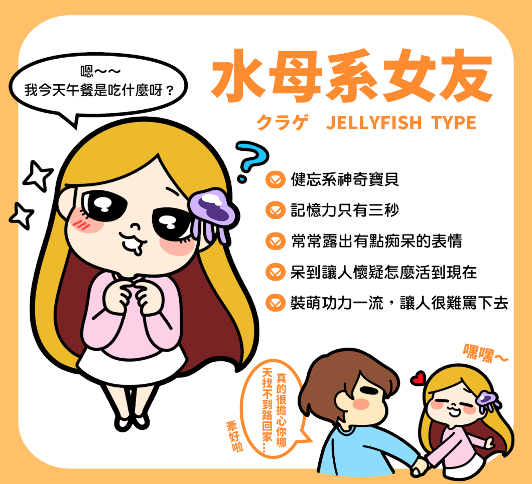 天然呆這種水母系女友也是常常出現!有時候讓人很想生氣,但是因為他們是真呆也不是裝笨,所以又不忍心罵下去(?)只能說這種屬性的女友或朋友真是讓人又愛又恨~