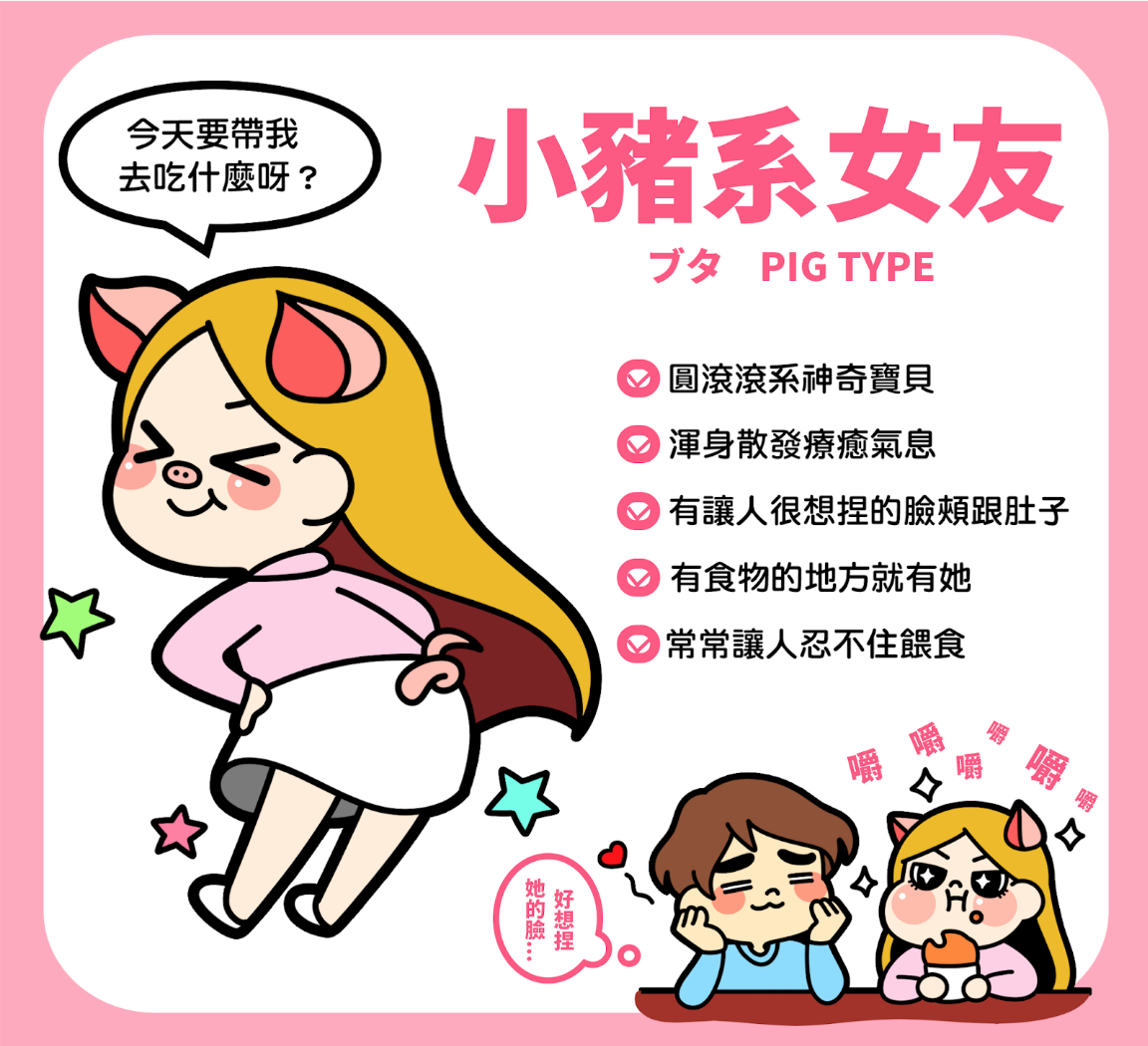 小豬系女友顧名思義就是吃貨女友啊!單純可愛又療癒,不挑食又愛吃的她們超好相處~只不過有時候可能會為了護食而跟你吵架(?)只要用食物就能輕易收服,這麼好的女友哪裡找XD