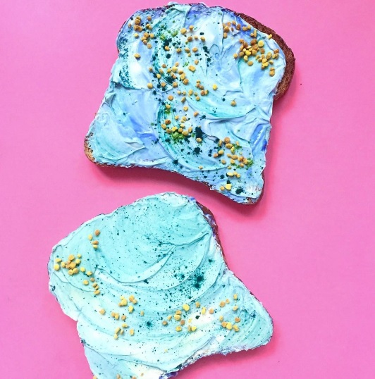 她會利用杏仁奶油或是乾奶酪,滴上幾滴天然色素後小心地攪拌,再擺上一些裝飾就完成超級夢幻的烤土司!