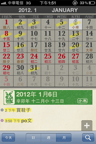 日曆最大的用處除了提醒你今天的日期外,當然還可以記事啦!懷舊日曆會自動與iPhone行事曆同步,輕鬆切換日曆風格,事情一件也少不了!紀錄的事情會以黃色蠟筆輕輕塗過…