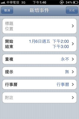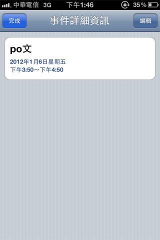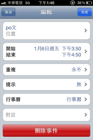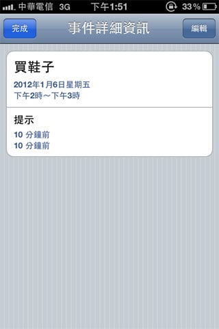 選取右上角的編輯,還可以進一步的修改,主旨、時間、提示一個都沒有少,跟iPhone內建的行事曆操作方式雷同,十分容易上手。