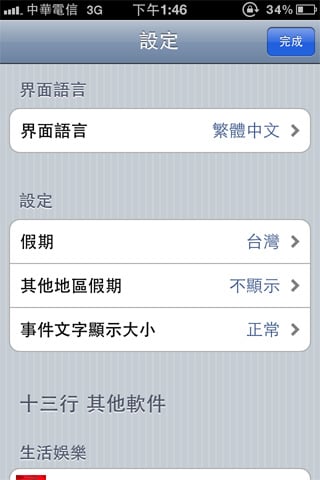 日曆左上角的「設定」,可以針對自己所處的地區來做修改,由於本程式是由華人所製作的,主要的界面語言則是中文
