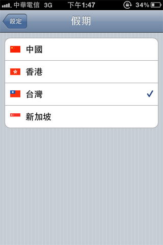 另有提供中國、台灣、香港、新加坡等地的假期選擇。