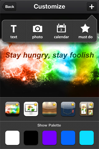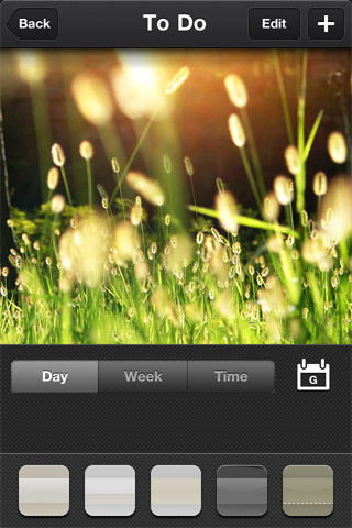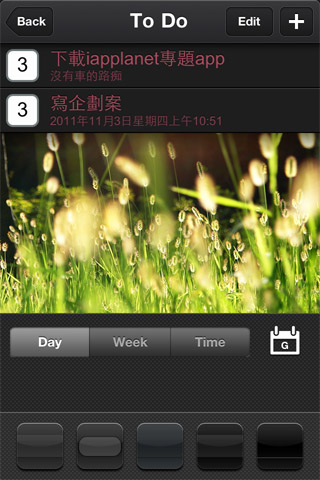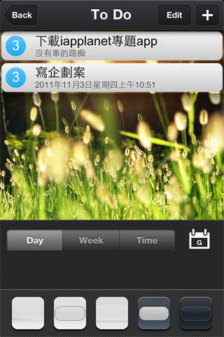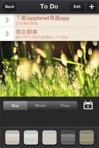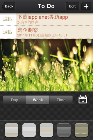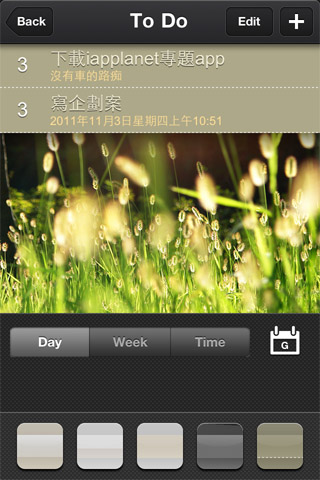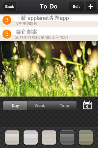接下來就是重頭戲啦,直接點選中間的背景圖,就會進入To do的修改,在圖片上左右推移,就可以變換內建的背景圖,目前沒有提供插入自己照片的功能。