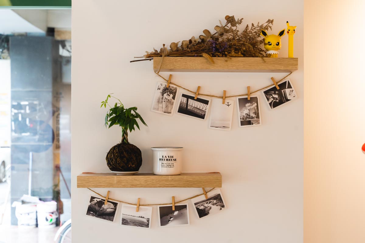 由於「栮苳之家」對面即是郵局且附近住宅門口也多有綠色元素,因此店家外觀上選用少見的綠色門面,既有眷村的古早味又帶點港式餐廳的復古感,看著看著浮躁的心情也跟著平靜了下來。而店內佈置則是給人一種日式的小清新感,採用溫柔調的木質窗口與桌椅,牆上貼有許多自己蒐藏的文創小物與旅遊時隨走隨拍的照片,營造一種質感文青、舒適寧靜、慢步調的用餐空間