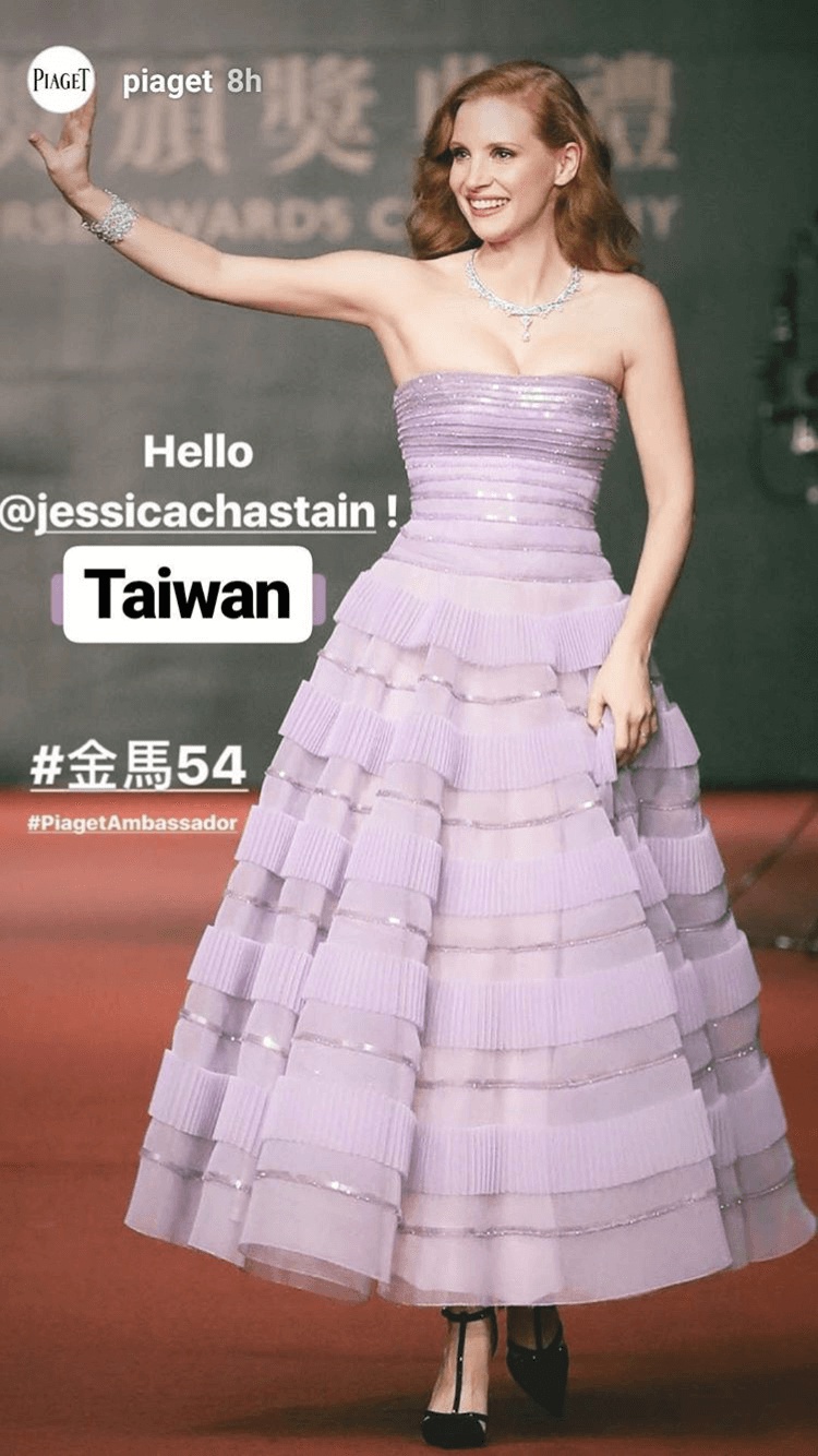 這次潔西卡崔絲坦(Jessica Chastain)受伯爵(Piaget)之邀來台擔任「伯爵大使」,選擇了台灣頒獎典禮紅毯上很少見的紫羅蘭淺紫色,優雅又大方的禮服為Armani Privé 2016的春夏系列,不需要穿上最新設計和款式,照樣殺光攝影師的底片!