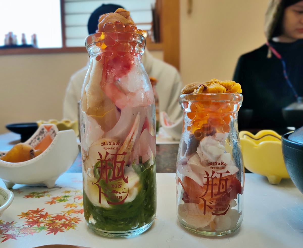 瓶丼是岩手縣宮古地區的特殊料理,一開始只是希望能將新鮮的海鮮好好保存,到最後演變成現在這樣特殊的吃法,今天來到的「蛇之目本店」也是當地非常知名的瓶丼餐廳,份量及海鮮種類也是最多的一間!