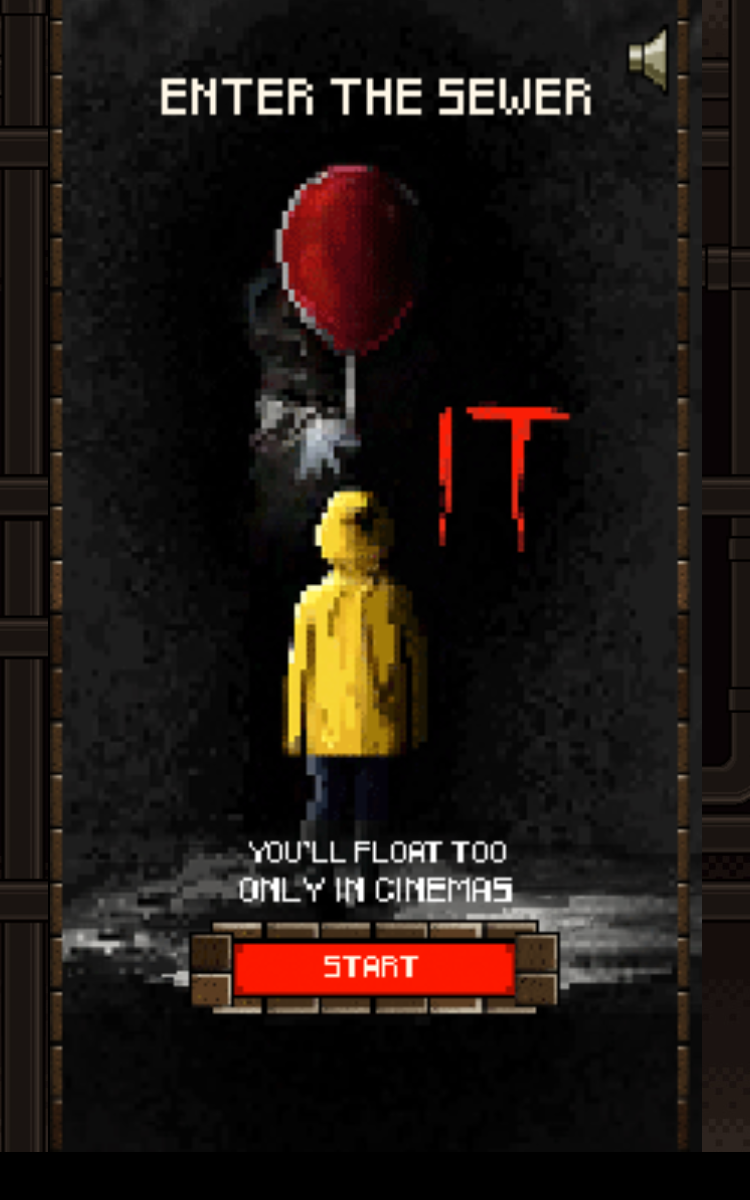 《喬治號漂浮中》在「這裡」可以玩,一打開畫面,就看到穿著黃色雨衣手拿紅氣球的代表圖案,點進START之後,就可以開始在下水道裡滑行囉!為什麼是下水道呢?