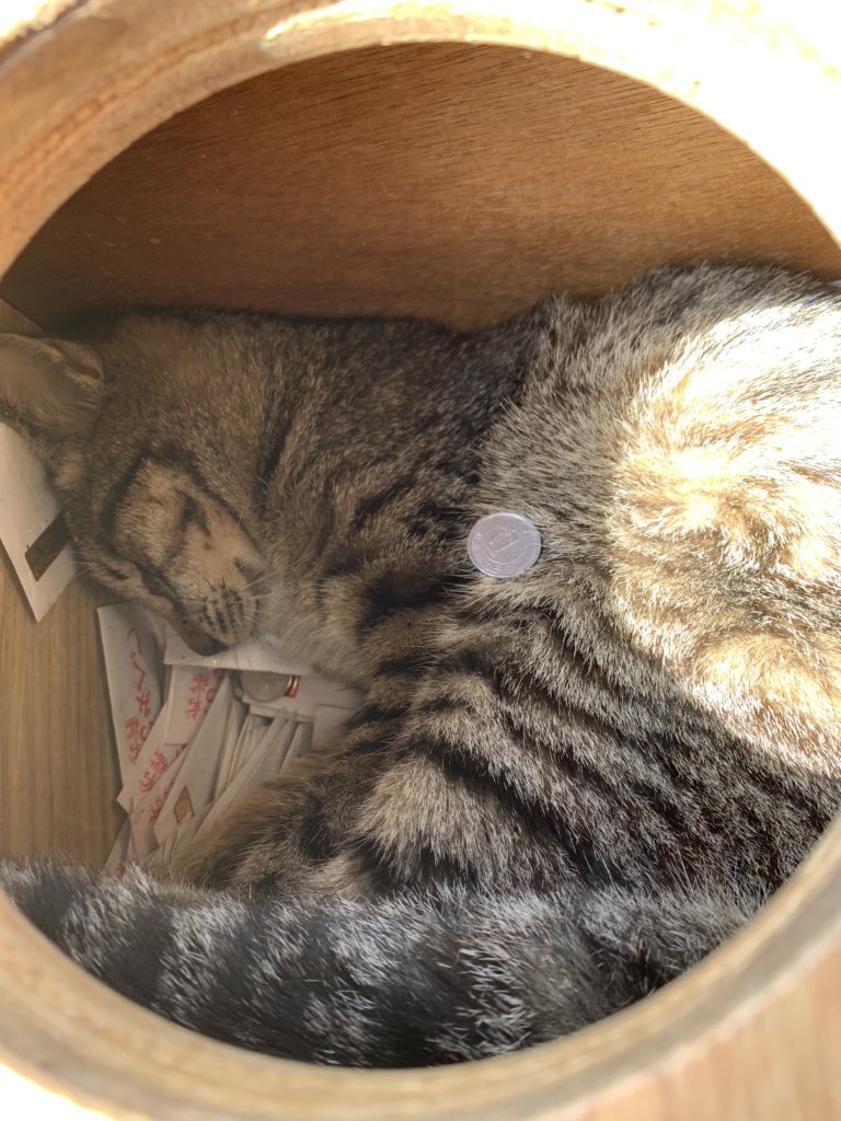 日前推主前往愛媛縣松山市,當他經過「石手寺」便決定要多留片刻參觀,參拜完看到旁邊擺著「運勢籤盒」,心血來潮想說可以求個籤,順便占卜接下來的旅程運勢。沒想到當他將手伸進籤盒,竟然摸到有東西「毛毛的」,心臟強大的推主往盒中一探究竟,原來是一隻縮成蝦仁的虎斑貓正在裡面倒頭大睡啦!(還以為是恐怖箱咧)