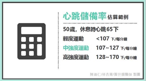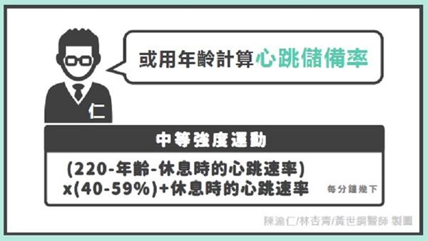 建議防疫在家進行中等強度的運動,可以調控免疫系統,減少感染病毒後變成重症的風險,也可以降低焦慮與壓力。至於,什麼是中等強度的運動?可以用運動時的費力程度當指標,例如一邊跑步、一邊能夠簡短對話交談,大致即屬於中等強度運動。或用年齡計算心跳儲備率,公式如下: