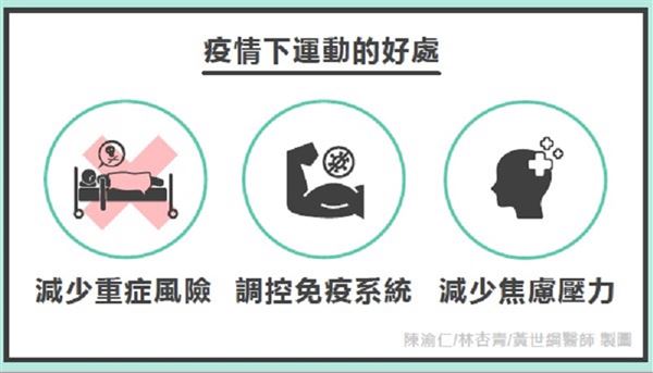 在疫情下運動有3大好處,包括:減少焦慮壓力、調控免疫系統、減少重症風險。建議一週累積做到150至300分鐘中等強度有氧運動+至少 2 個時段肌力訓練。但是,並不是運動強度愈高愈好,若平常不習慣高強度運動,突然做超過90分鐘的高強度運動,反而會對免疫系統有害。