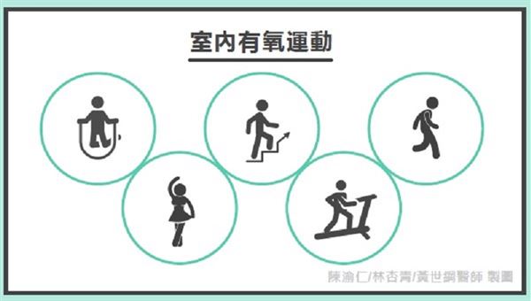 建議做哪一些運動呢?在室內運動,可以選擇跳繩、爬樓梯快走跑步機快走或跳舞等,以及別忘做肌力運動,例如伏地挺身、深蹲、階梯有氧等。