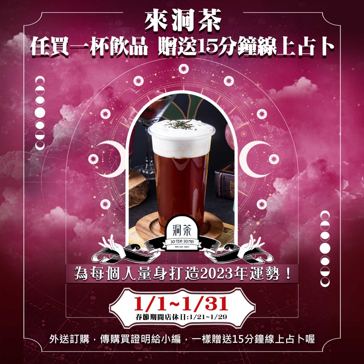 即日起至2023年1月31日,到《洞茶》愚者店現場消費(不限杯數金額),並加入《洞茶》魔術師的官方line@,就能和占卜師約定時間神預測2023年的運勢,還不立馬開喝!