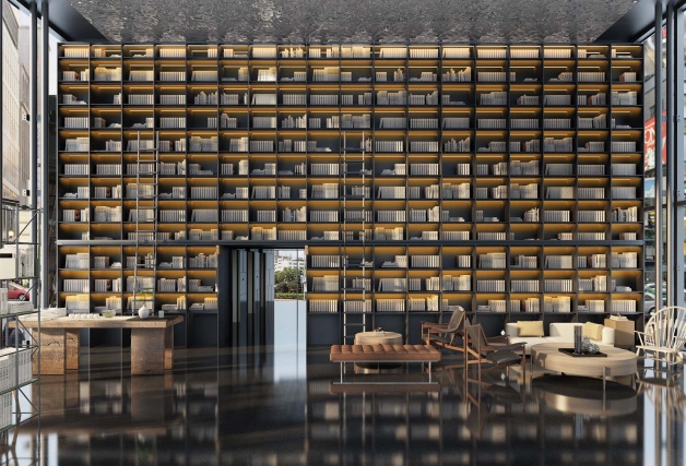 因為是共構酒店,妞妞們從一樓接待入口處書牆走入,就能抵達位在25樓飯店大廳,接待空間特別使用挑高設計,窗前一側還有專門為旅客準備的茶軒,承億用一席茶香和一片風景迎接大家的遠道而來,大廳中心還設有書籍延伸為牆的閱讀廣場、藝術裝置和擺件,讓緩緩訴說一場台灣之旅,讓賞閱跳脫紙本!