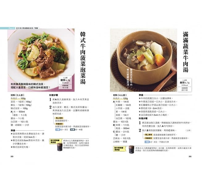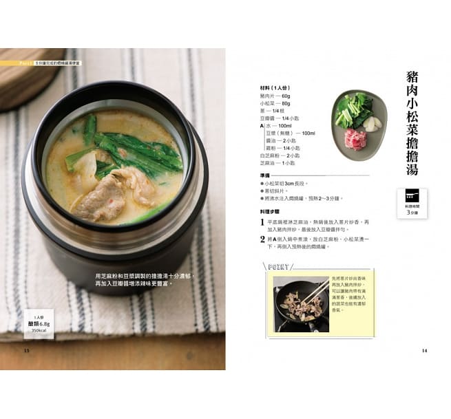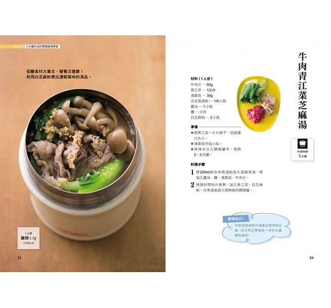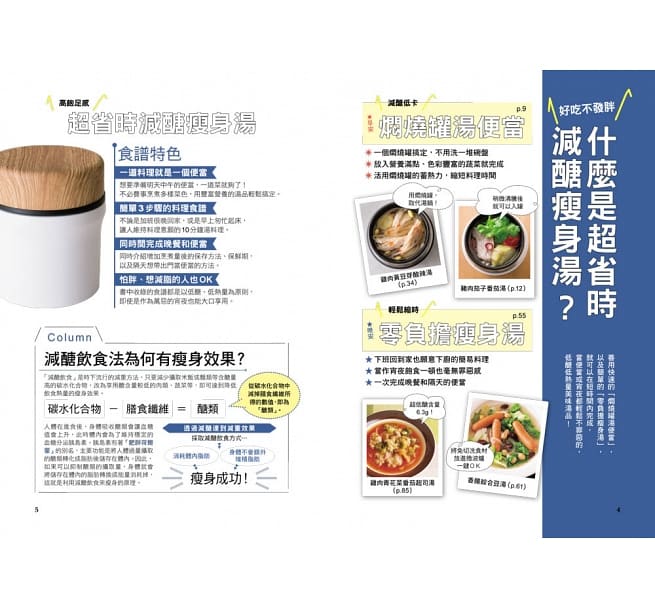 這本湯料理書從豆腐、肉類到海鮮,低醣主菜各有清楚專章,不論是挑選菜單或購買食材都不怕有選擇障礙,一樣主食還能變出多樣湯品,不怕食材過剩也不怕吃膩!同時教學善用免切食材、燜燒罐及微波爐,以最大限度降低「料理步驟、事後清洗」,活用冷藏冷凍技巧,5分鐘搞定湯料理,食譜最低醣含量不到1g,最高熱量不超過500卡路里,絕對是陪你冬季減肥的最佳零負擔瘦身湯!