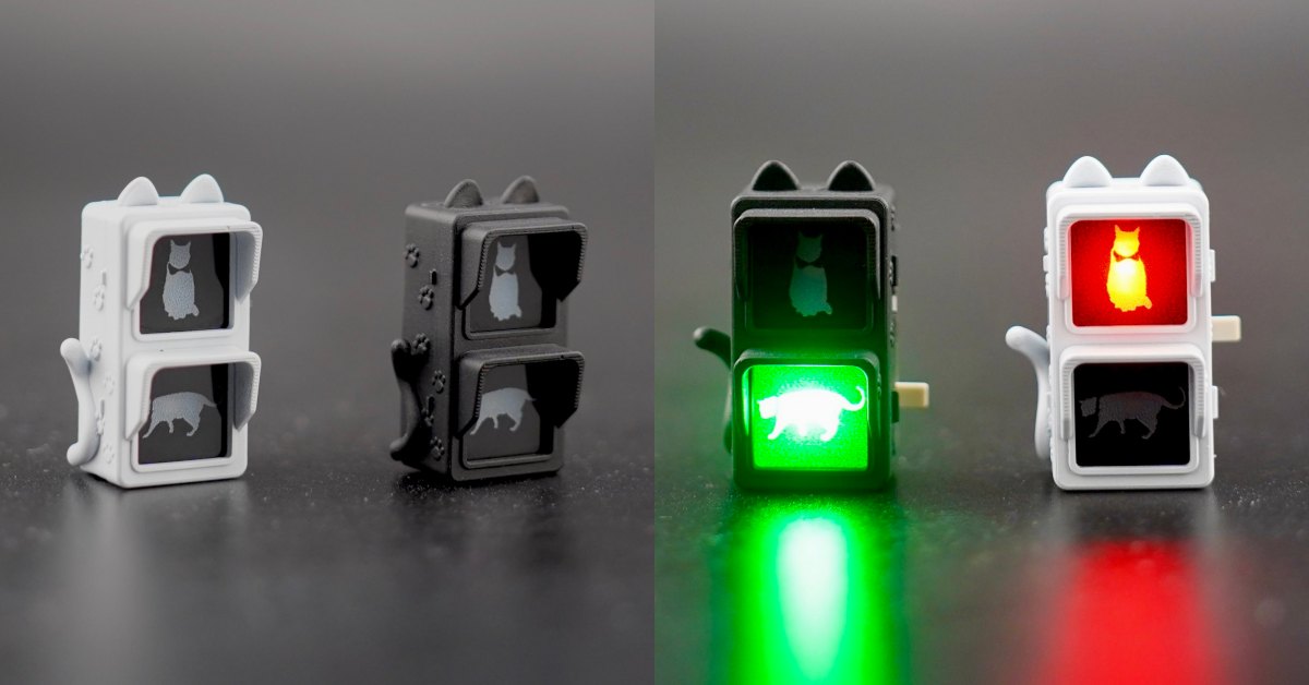 在2024年的222貓之日,マルま工房為了這天特別製作「貓貓版本紅綠燈耳環」,不只多出尖尖的貓耳朵,側面還有貓掌印浮雕、立體貓尾巴,最可愛的是發光燈號也從小人換成貓貓啦!(再次被萌到尖叫~)可惜這款目前尚未有發售的計畫,但也可能因為大家敲碗而決定商品化哦!