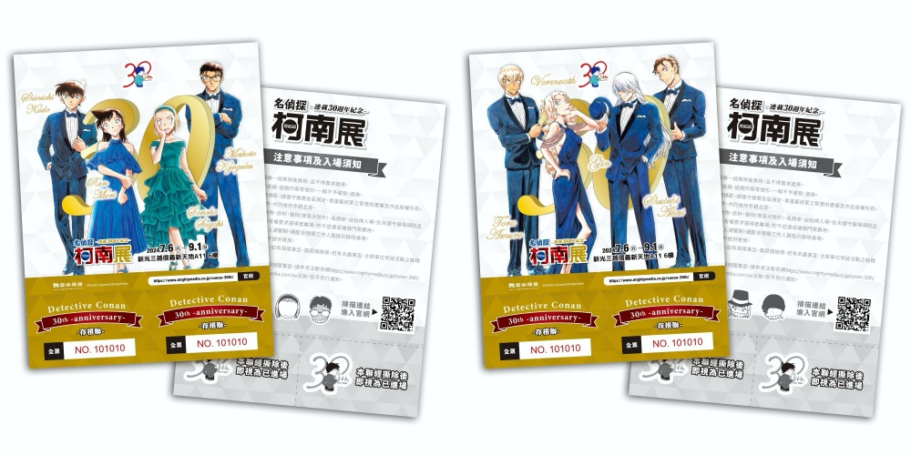《名偵探柯南 連載30週年紀念展》預售票將自6月7日開賣!展覽雙人票搶先販售3款專屬的配對設計,而票根在入場後還可以當成收藏卡紀念。另外,現場也準備了「基德&平次&和葉」同框的獨家套票等著粉絲們收藏!