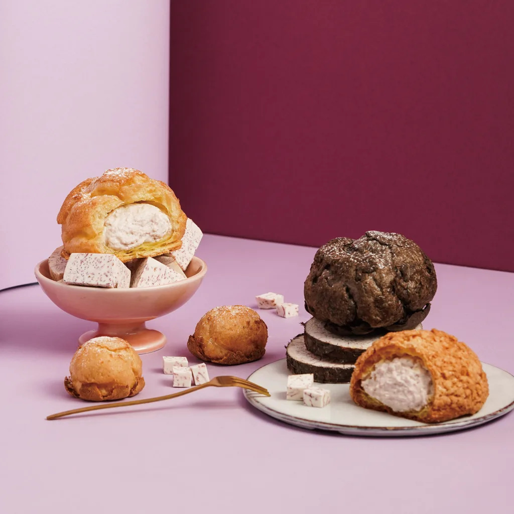 2023年9月限定口味「芋泥奶霜泡芙」,是嚴選大甲檳榔心芋頭,搭配發酵奶油與鮮奶油製成奶霜內餡,相較於其他純鮮奶油與卡士達的餡料,這款芋頭奶霜的口感吃起來反而更為綿密,雖然妞編輯不愛芋頭,但這款給過!