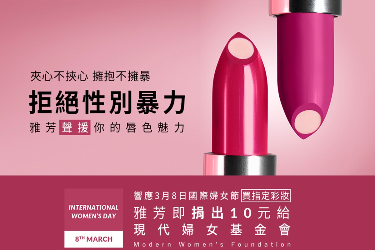 2021年起,AVON雅芳台灣與現代婦女基金會合作,攜手對抗性別暴力,共同致力讓每位女性都能擁有更無懼且美好的生活。我們深信,每一位女性都應當受到尊重,被平等對待。在一年一度的國際婦女節,AVON推出嶄新的夾心唇膏新品,全球同步發售,從世界各地共同發聲,鼓勵大家#SPEAK OUT,勇敢說出來,以行動拒絕性別暴力。凡購買指定彩妝商品,每支即捐出$10元,捐款金額將持續贈予給現代婦女基金會,幫助受暴者並推動婦幼人權。