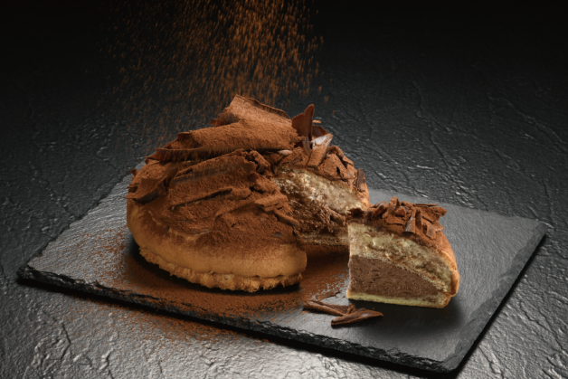 「貝可拉極濃生巧生乳捲」嚴選貝可拉100%純可可粉,在柔軟的泡芙蛋糕表面揮灑出充滿文藝氣息的流動線條;內餡捲入整條貝可拉73%生巧克力,與北海道奶霜融合後,入口即化的口感一吃著迷,加上巧克力酥菠蘿的搭配,多層次的堆疊創造濃郁感,是專屬於大人味的微苦醇香!