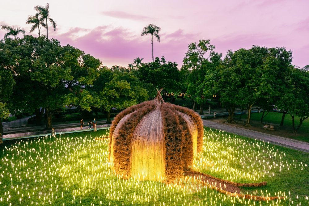 在擁有百年歷史的麻豆總爺糖廠遺址,林舜龍老師的作品《孕》以竹子編構出一顆高達4米的扁球體,象徵生命的孕育與成長。作品以層次豐富的結構呈現,外型猶如一顆卵,寓意著生命力的迸發與自然的和諧。日間時光,日光從裝置的孔隙間灑入內部空間,形成一種神聖的時間流動感,讓人彷彿置身於自然母體之中;而夜晚,燈光照射在竹製結構上,浪漫又詩意地表現出一種沉靜的生命之力。此作品不僅延續了臺南糖業發展的歷史記憶,更在空間中描繪出大地生養的永續之美。